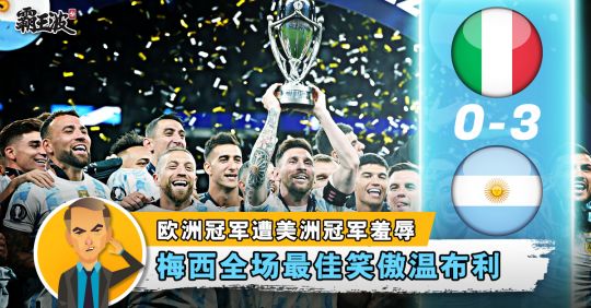 鸟叔:南美冠军阿根廷队3比0大胜欧洲冠军意大利队,拿下利西马决赛杯,劳塔罗、迪马里亚和迪巴拉各进一球,队长梅西则助攻梅开二...